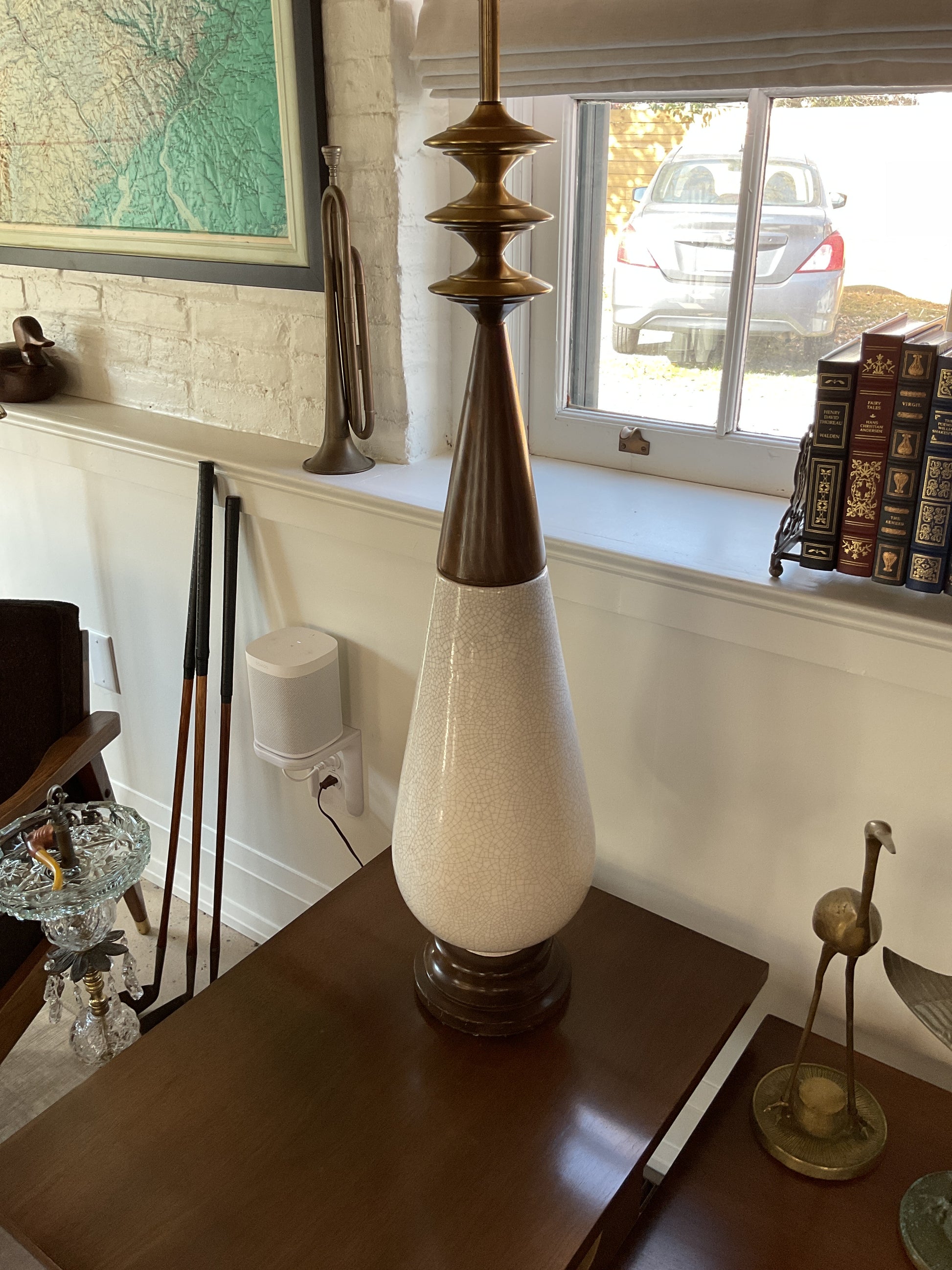 Large Porcelain and Wood Lamp Pair